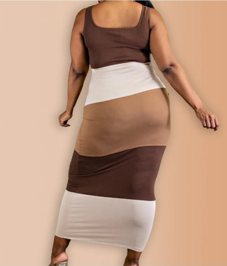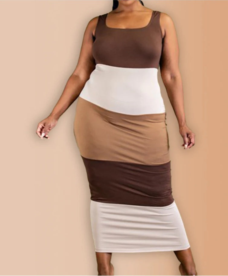 Embrace your curves in our In the Nude Plus Size Dress. This stunning color block maxi dress is designed to flatter your figure with its fitted silhouette and sleeveless design. Perfect for any occasion, feel confident and gorgeous in this plus size dress.