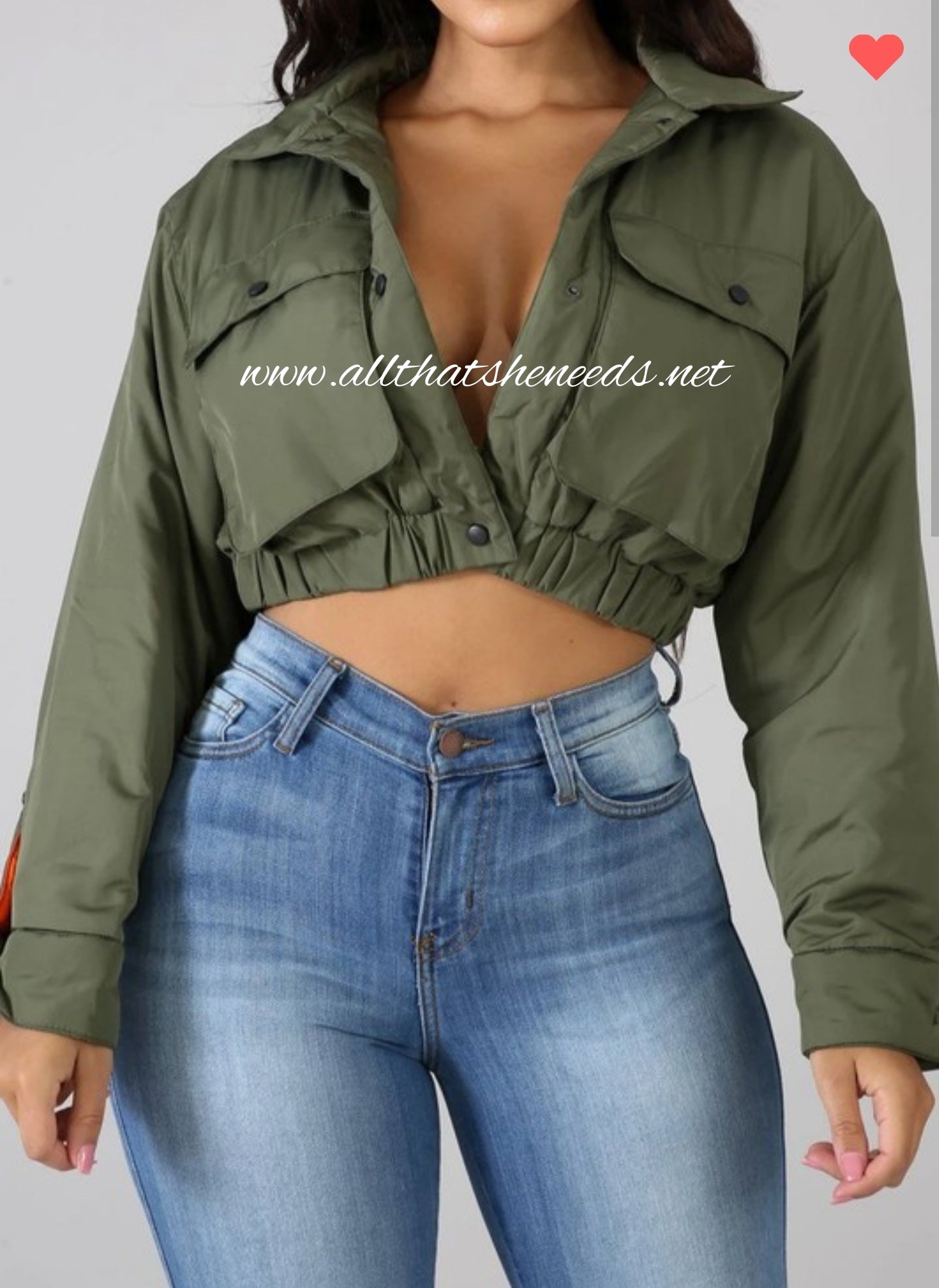 Crop jacket with wide functional front pockets. Front button down and sleeve closure w/orange inner lining.