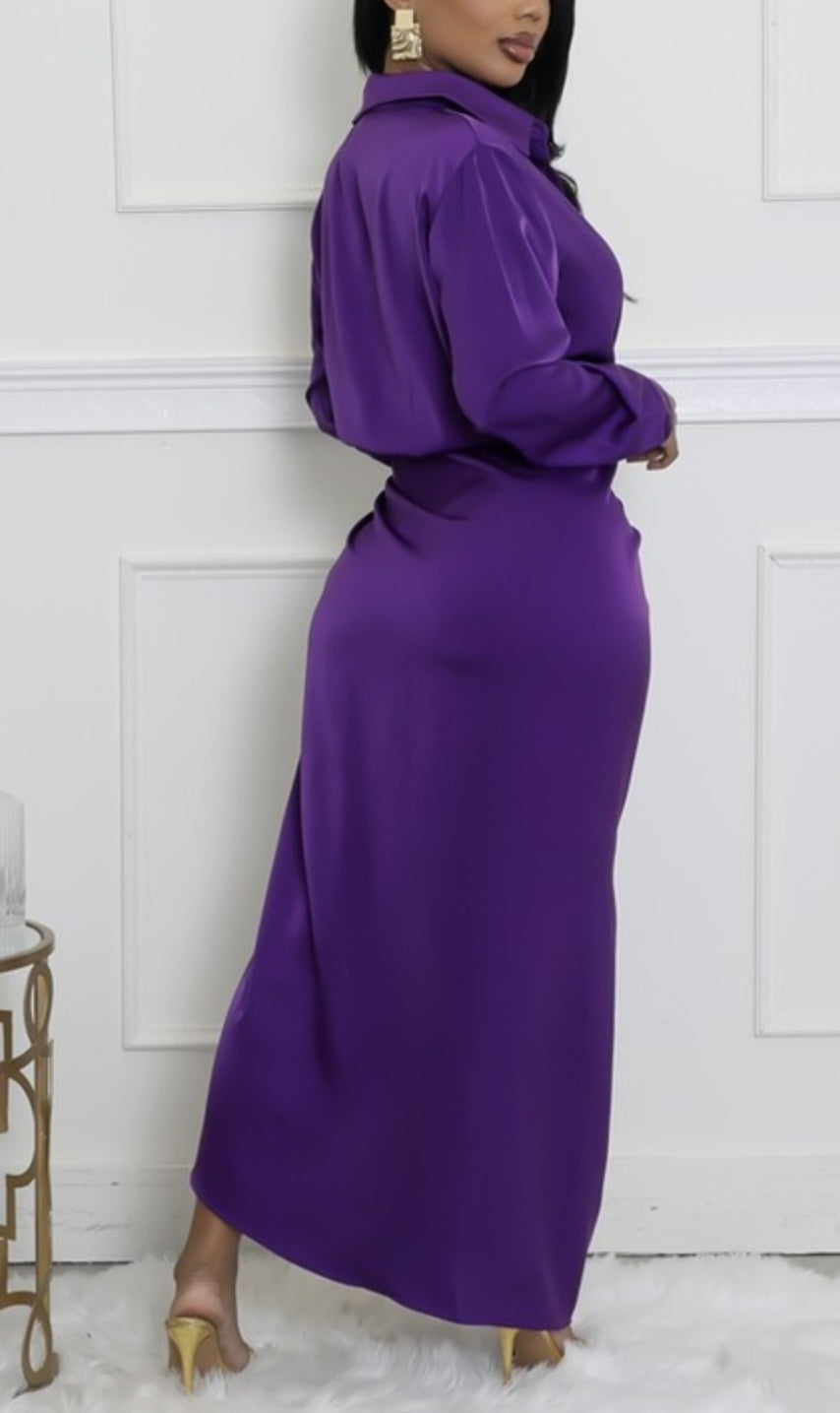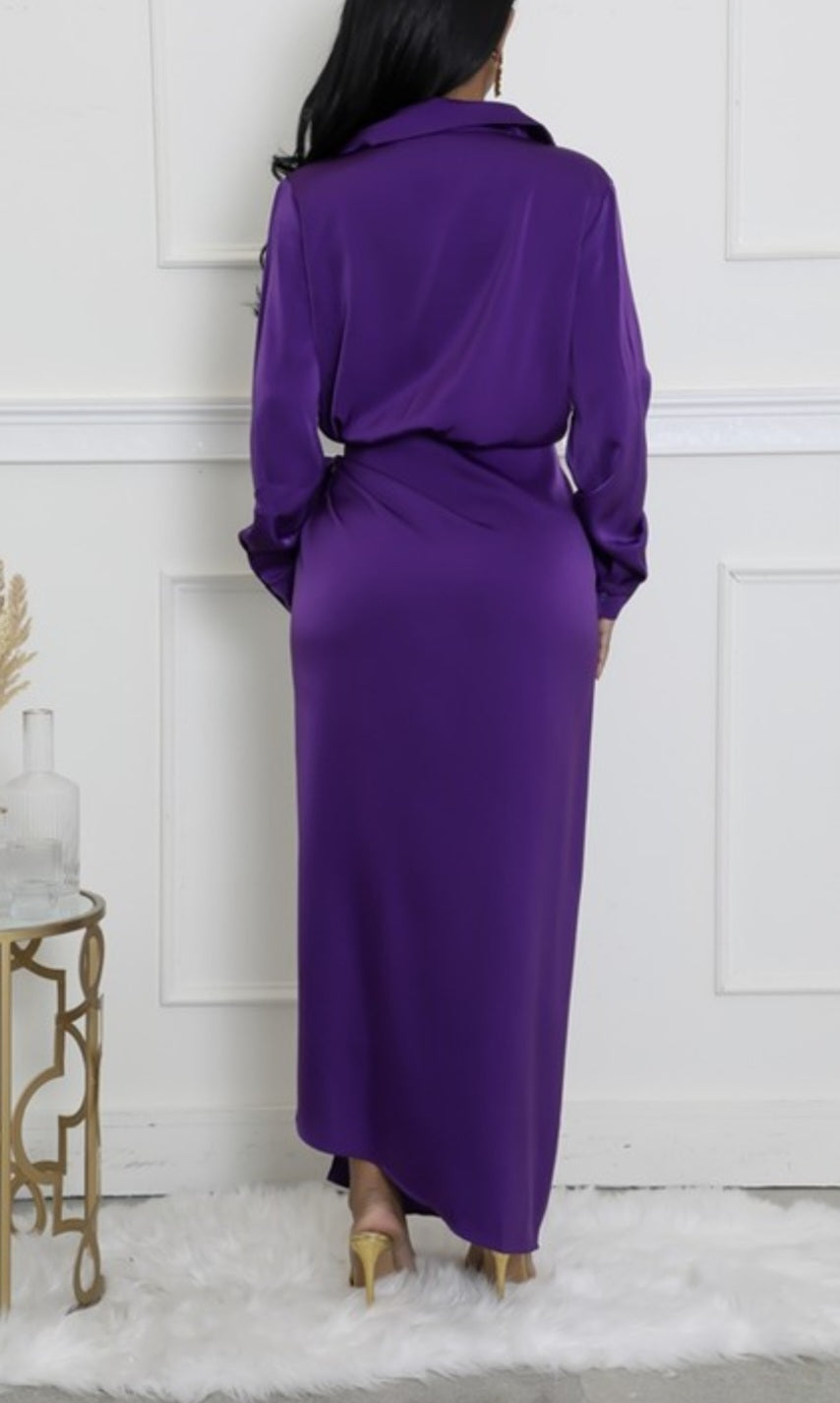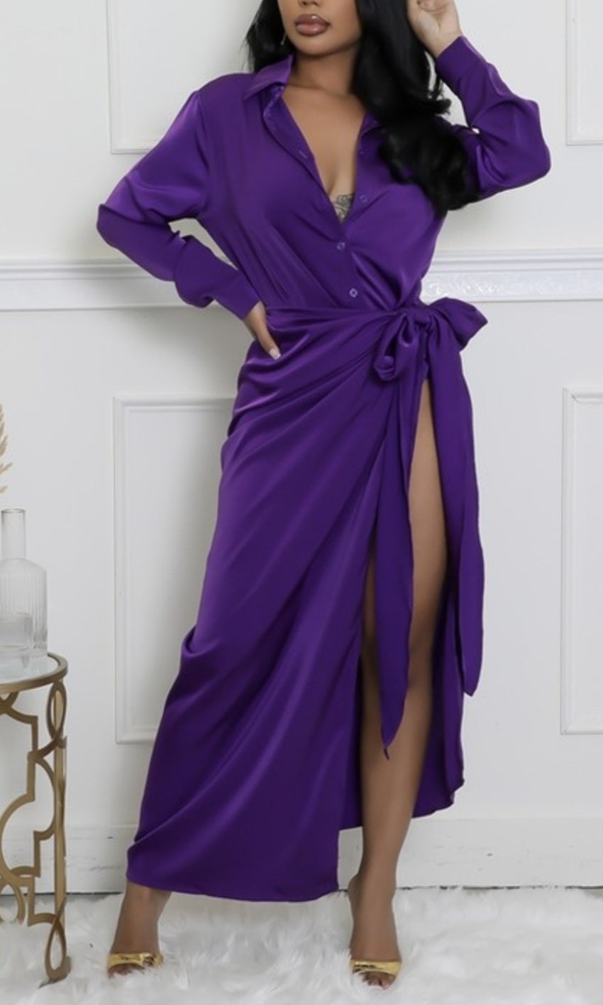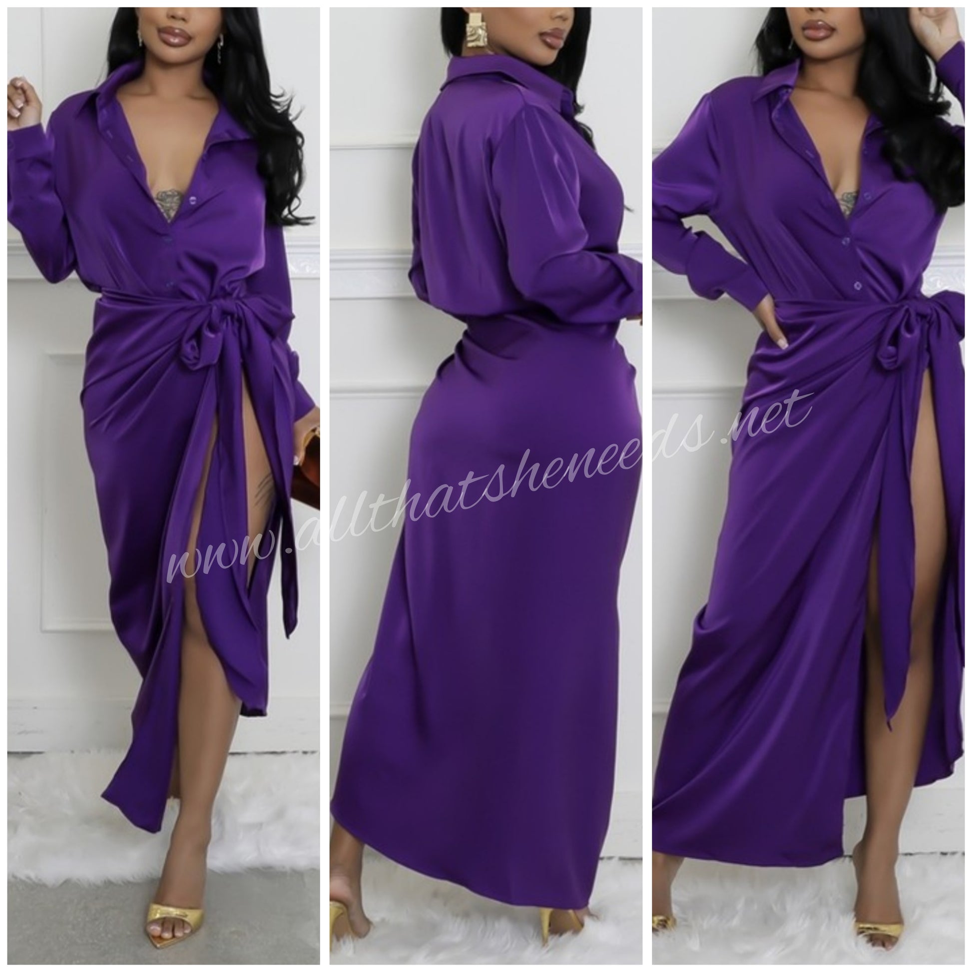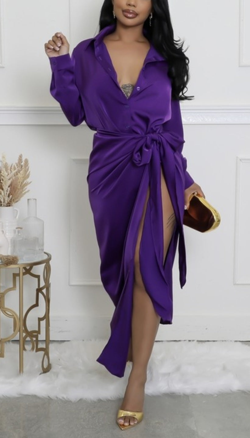 Unleash your inner goddess with our Purple Goddess 2 Piece Skirt Set! This daring ensemble features a semi-stretch satin material for comfort and a high-waisted skirt with a sexy leg slit for a bold statement. The collar, button down, long sleeve, and self-tie shirt add a touch of sophistication to this adventurous outfit. Take a risk and stand out in this set!