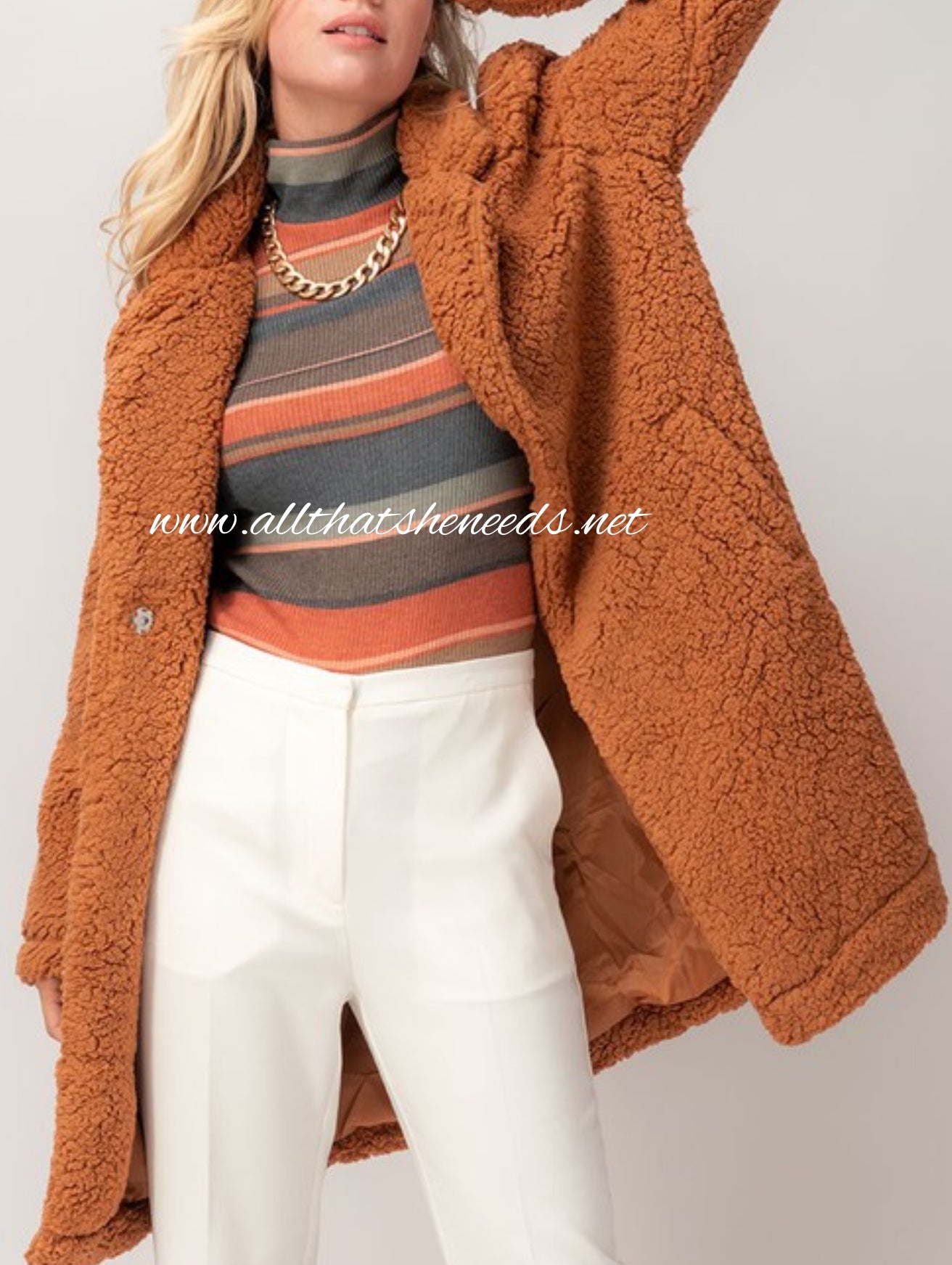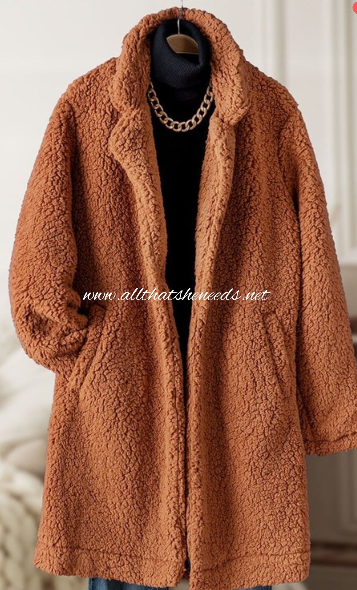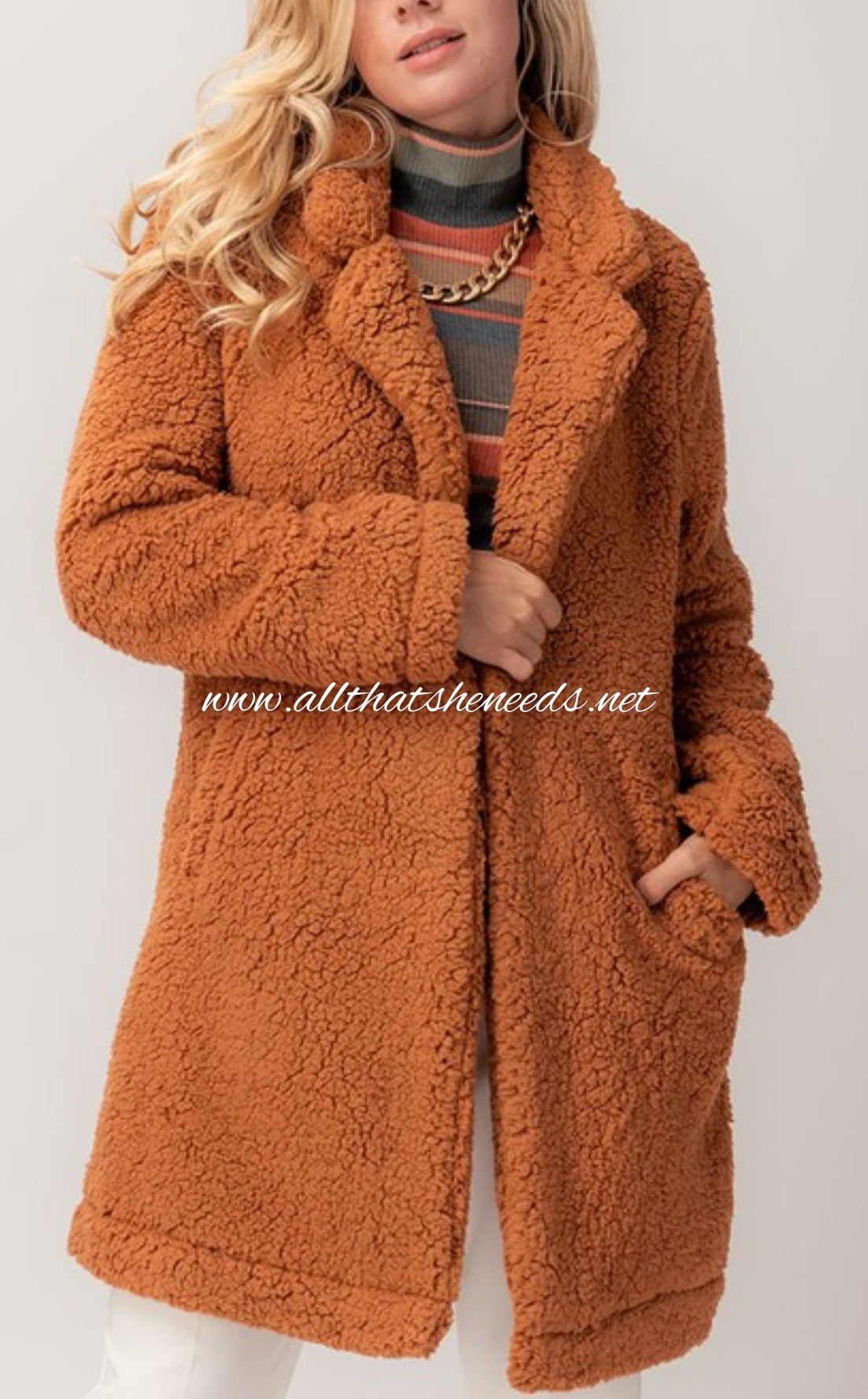 Sherpa, fleece, quarter length, long sleeve jacket with one button closure and side pockets.